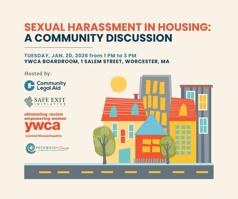 Join Community Legal Aid, Pathways for Change, Inc., YWCA Central Massachusetts, and Safe Exit Initiative on January 20, 2026 from 1 P.M. to 3 P.M. for an important event raising awareness about sexual harassment in housing.