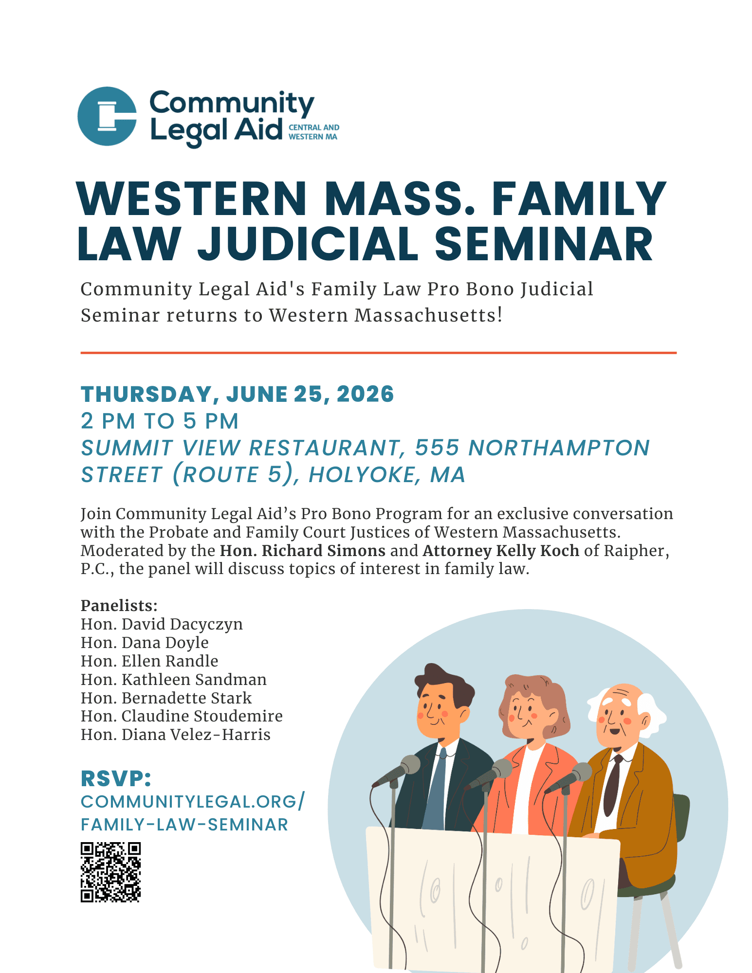 2 events,The Hampden County Conciliation Project, a collaboration between Community Legal Aid (CLA) and the Hampden County Bar Association (HCBA), assists… Sign up to be a Lawyer for the Day! Advise litigants on their family law matters at the Worcester Probate… |
